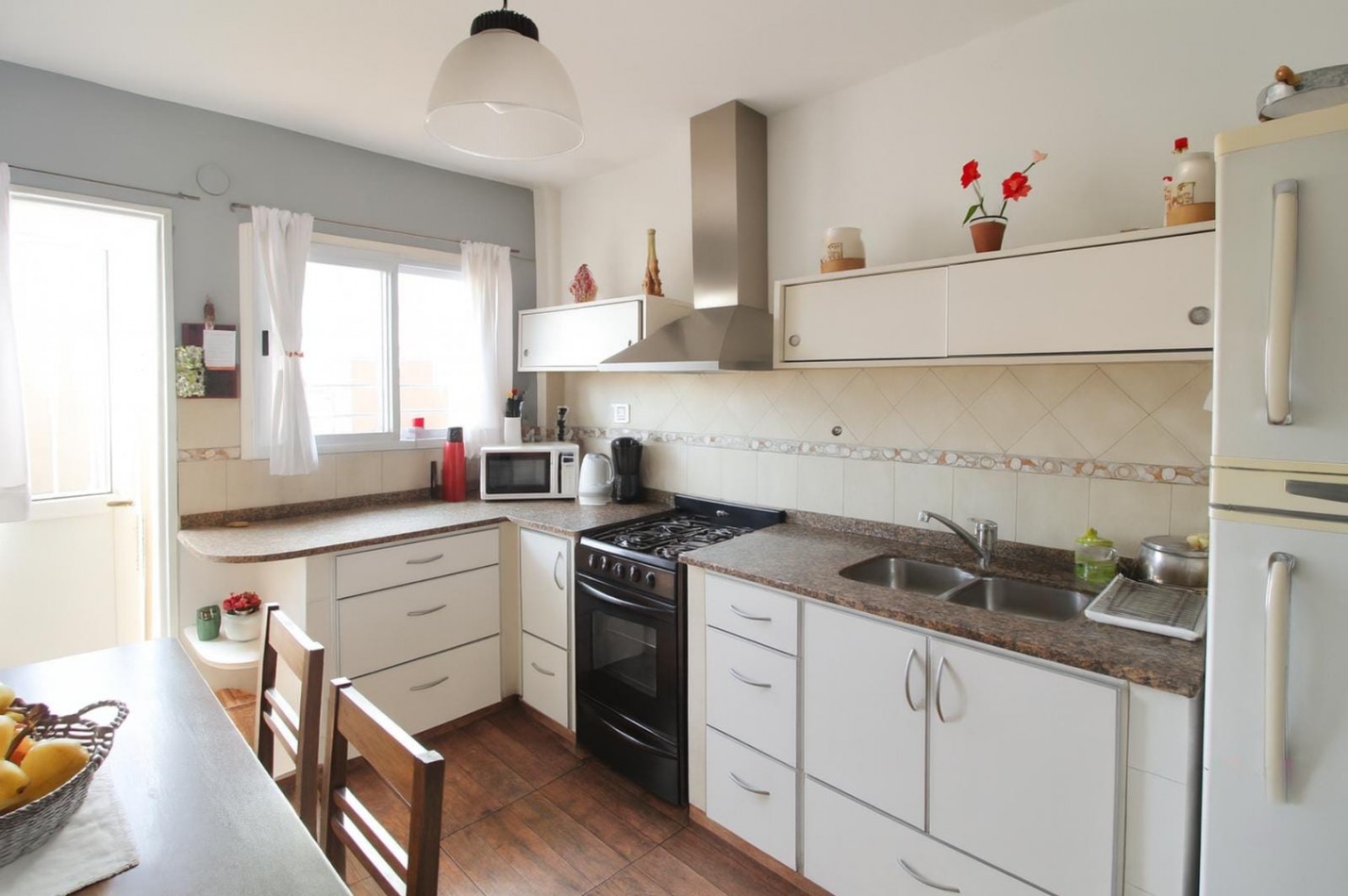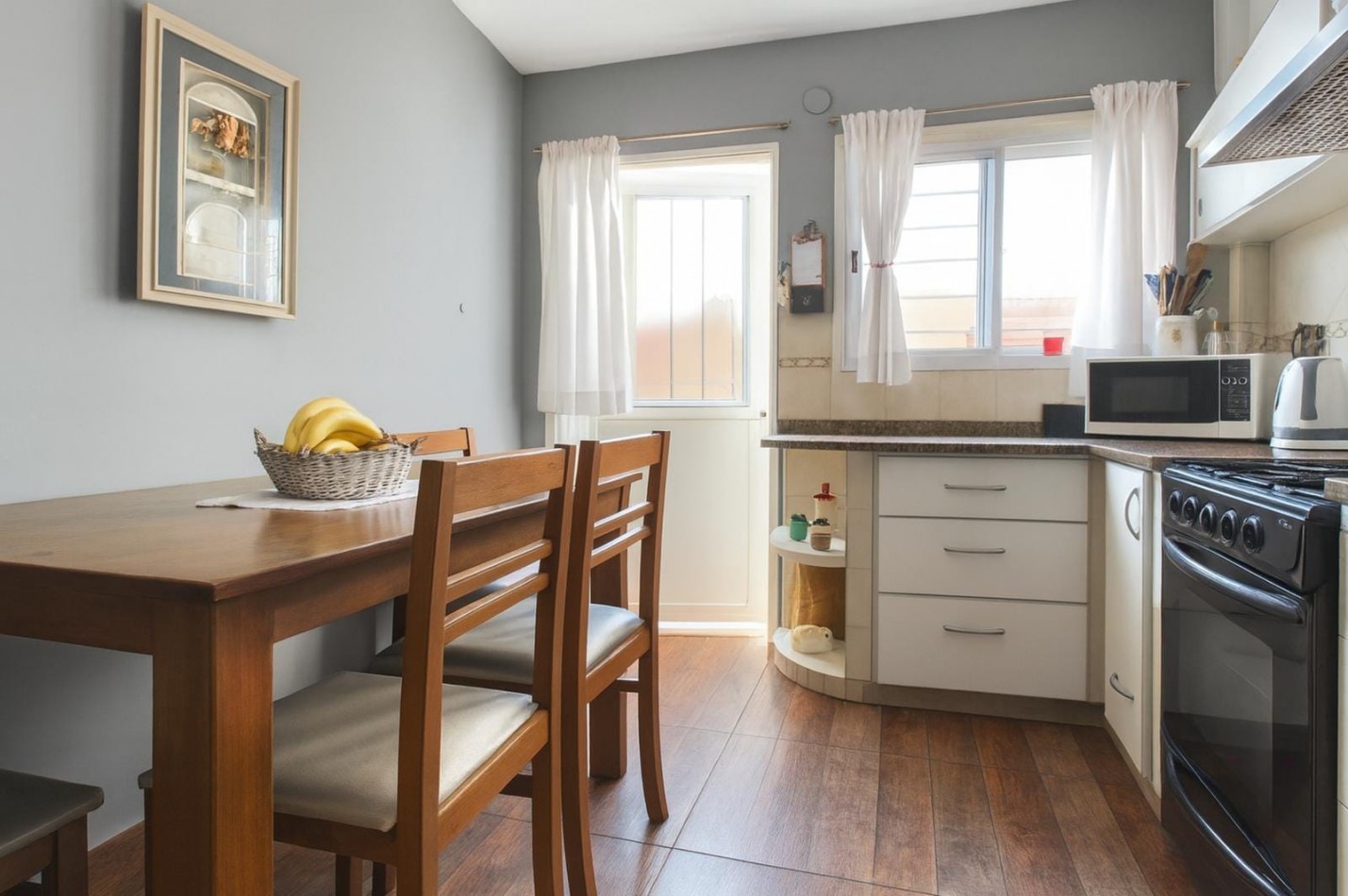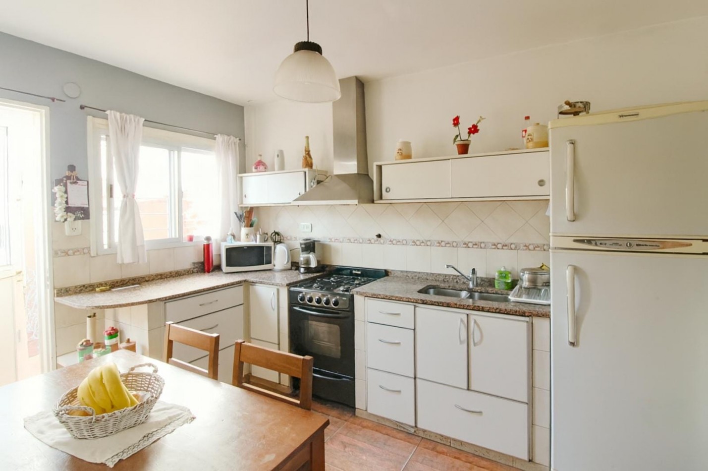 La cocina se comunica con el living-comedor, el cual posee un ventanal al frente. Adyacente a este sector, encontramos un ambiente adicional, adaptable como habitación o escritorio, con ventana al patio.