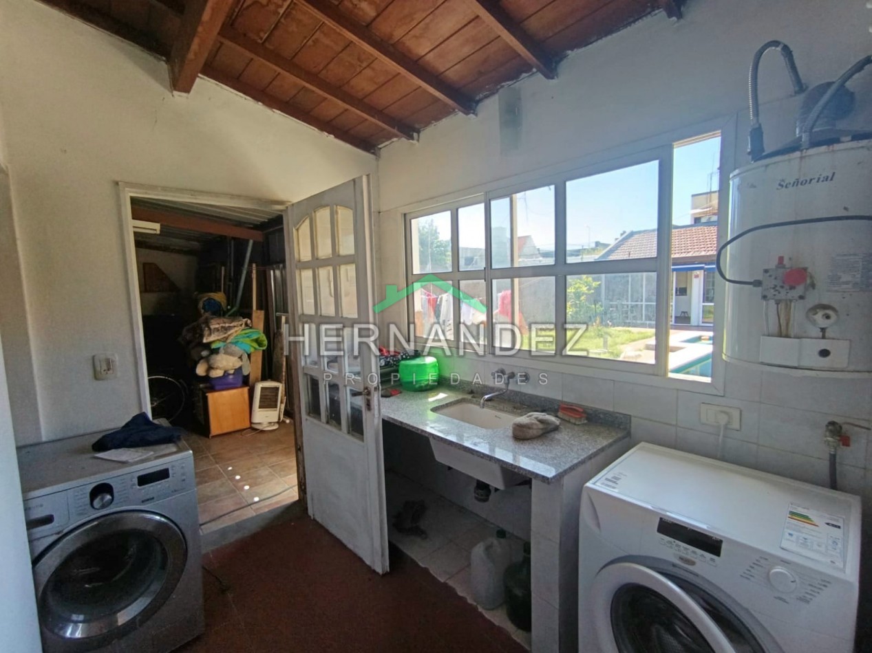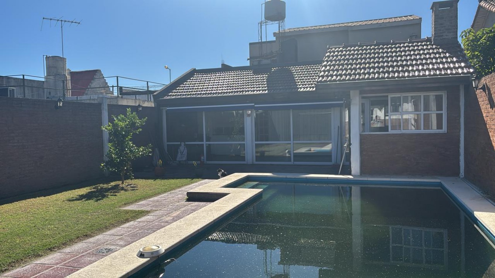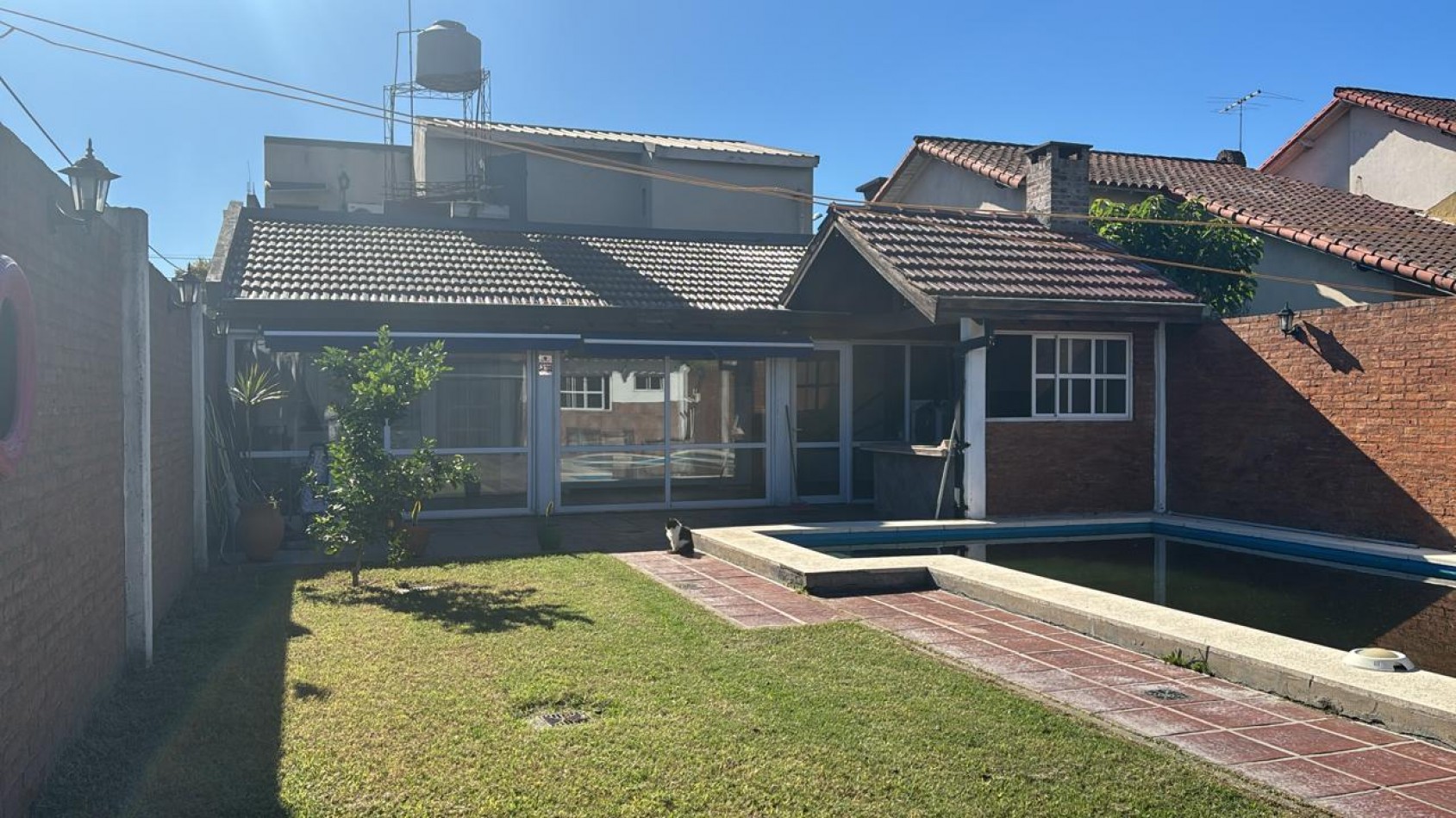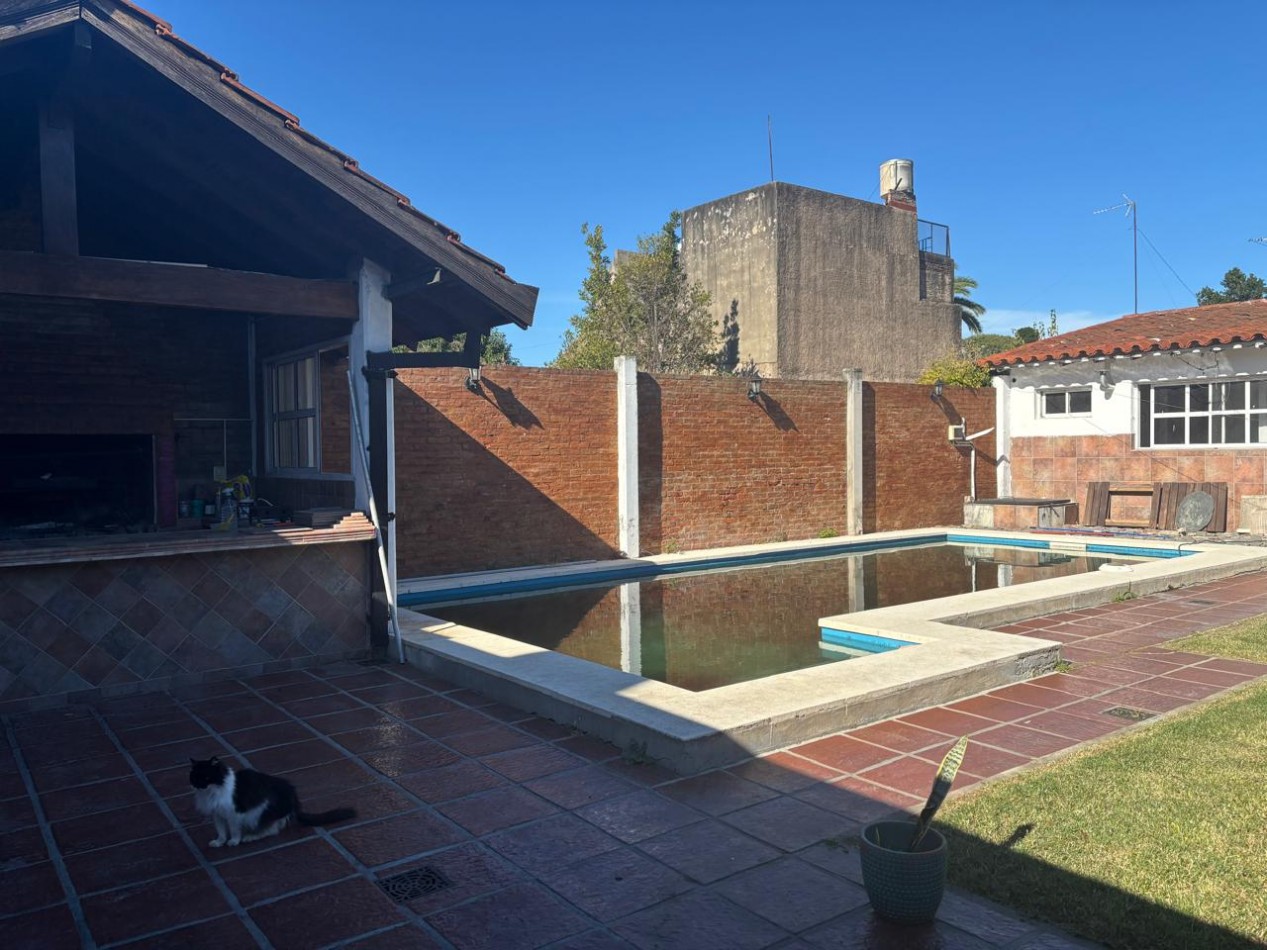 En planta baja cuenta con ingreso para auto con portón automático en cochera semicubierta, al ingresar nos encontramos con un amplio living comedor que da acceso a la izquierda a 3 dormitorios y un baño, a la derecha nos encontramos con la cocina y comedor diario refaccionados a nuevo, luego cuenta con una amplia galería cerrada, parrilla y horno de barro, piscina de cemento de 2,20 metros de profundidad y en el fondo cuenta con una dependencia de servicio: galpón, lavadero, baño y otro dormitorio.