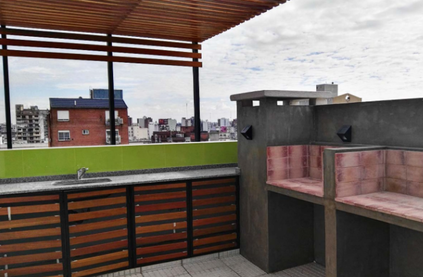 En terraza Solárium con deck de madera, parrillas y sector de uso común con pérgola.