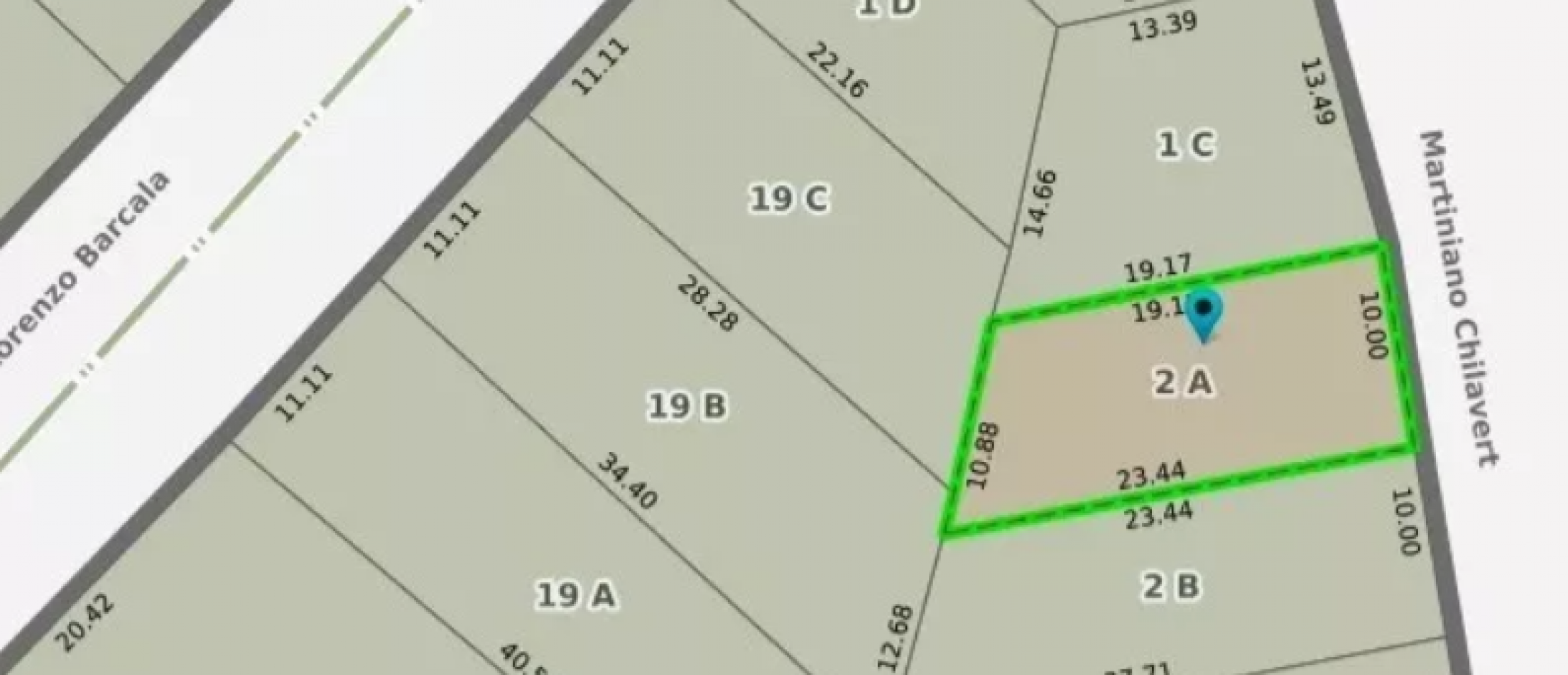 Frente de 10 m por 23,44 m. de un lado y 19, 17 m del otro lado .